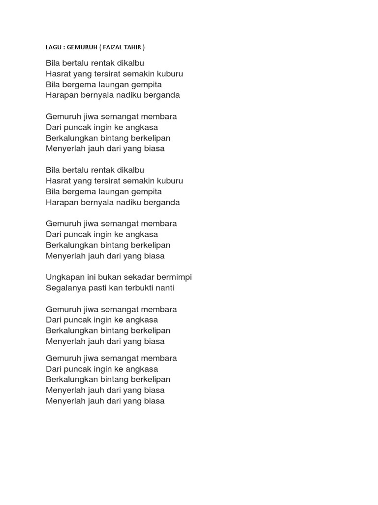 Related : Faizal Tahir Gemuruh Lirik / Gemuruh jiwa semangat membara dari puncak ingin ke angkasa berkalungkan bintang berkelipan menyerlah jauh dari yang biasa ungkapan ini bukan sekadar bermimpi segalanya kan pasti terbukti nanti..