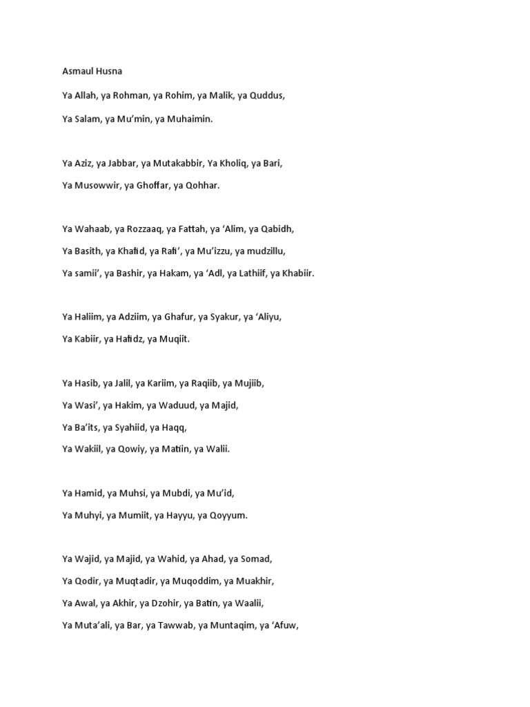 Ya allah, ya allah ya allahu, ya rahmanu, ya raheem ya malik, ya quddusu, ya salaam ya mu'minu, ya muhayminu, ya 'aziz ya jabbar, ya mutakabbir, antal khaliq antal bari'ul musawwir ya ghaffar, ya qahhar subhanak.