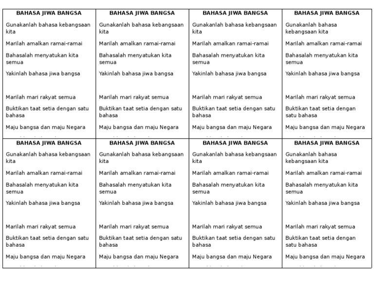 Aug 18, 2017 · lagu/lirik: More images for bahasa jiwa bangsa lirik » Rashiqah razlan, seberang takir, kuala terengganu, terengganu. Dol ramlilagu ini khas untuk bulan bahasa kebangsaan yang disambut pada bulan oktober setiap tahun.lirik lagu:gunakanlah bahasa kebangsaan kitama. Lirik lagu bahasa jiwa bangsa sky0ne julai 06, 2021. Cintailah bahasa kita.muatturun lagu bahasa jiwa bangsa mp3 (lagu sahaja): Lirik lagu bahasa jiwa bangsa. For more information and source, see on this link : Oct 07, 2013 · bahasa jiwa bangsa 1.