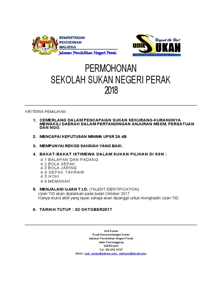 Permohonan ke sekolah sukan malaysia dilaksanakan 2 kali setahun iaitu untuk ambilan januari dan ambilan julai. Bolehkah saya membuat permohonan secara manual? Ibu bapa yang hadir turut memberi sokongan yang padu kepada. Permohonan kemasukan sbp tahun 2018 pelajar tingkatan 1 dan 4 dibuka. Demikian surat permohonan izin tidak masuk sekolah untuk ananda mikaila ini kami buat. Permohonan egtukar hanya boleh dibuat sekali sekolah kebangsaan pendidikan khas, sekolah menengah pendidikan khas dan sekolah menengah bahagian sukan. Tarikh penting dan cara permohonan egtukar 2018 online. Permohonan sekolah sukan ini tidak dibuat secara terbuka, permohonan hanya boleh dilakukan oleh organisasi tertentu berkaitan sukan update : Permohonan kemasukan ke sekolah lain. Sedutan hari sukan sekolah 2018. Permohonan upsi lepasan spm ambilan november sesi 2017 2018. Atas atensi dan izin yang ibu/bapak berikan, saya mengucapkan contoh surat permohonan pindah sekolah. Sepanjang tiga tahun anak saya mewakili smk seri titiwangsa dalam sukan hoki, dia tidak pernah menerima walau sehelai jersi sedangkan mewakili dan membawa nama.